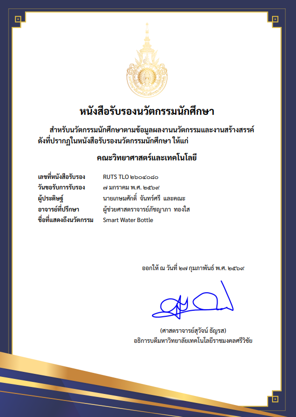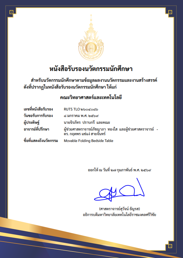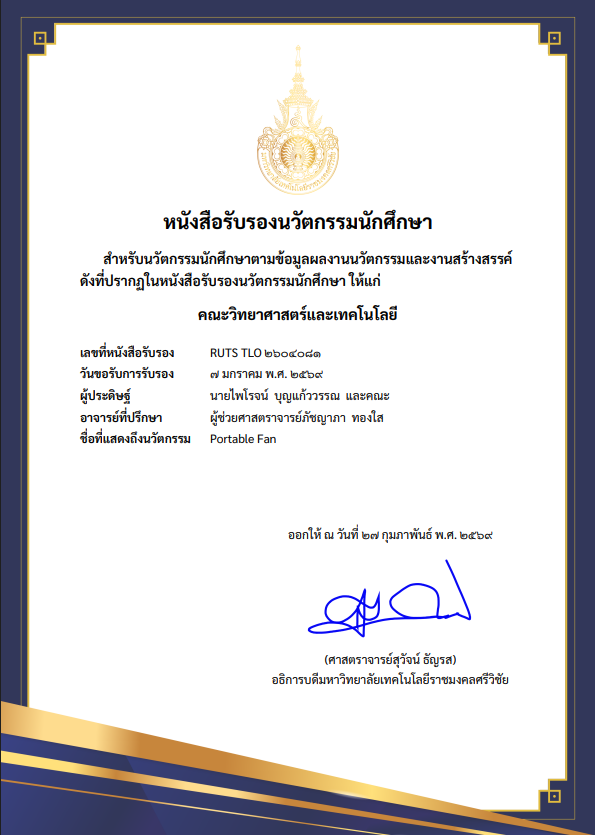 คณะวิทยาศาสตร์และเทคโนโลยี มทร.ศรีวิชัย ขอแสดงความชื่นชมและยินดีกับนักศึกษาและที่ปรึกษาผลงานนวัตกรรม ในโอกาสที่ “ได้รับการรับรองนวัตกรรมนักศึกษา” จากสำนักการจัดการนวัตกรรมและถ่ายทอดเทคโนโลยี (สจท.) ประจำปีงบประมาณ 2568